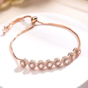 Bracelet : This stunning bracelet features an 18K rose gold plating, beautifully adorned with sparkling cubic zirconia stones arranged in a series of round motifs. The adjustable chain ensures a perfect fit, adding a touch of elegance to any ensemble. Occasion : Bring your style to a whole new level with this handcrafted piece of jewellery. When you’re celebrating a special Occasion : – a birthday, wedding, or personal milestone – this piece adds that extra something that makes us feel special and looking our best. Material : & Care Dimension : Size : Length : 13 cm, Width : 0.7 cm Material :Brass Care Label : It is advisable to avoid contact with water and organic chemicals i.e. perfume sprays. Store jewellery in airtight box. After use, wipe the jewellery with soft cotton cloth.