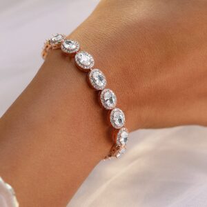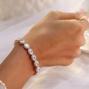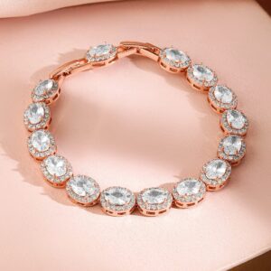 Bracelet :An exquisite 18K rose gold-plated bracelet featuring oval-cut AAA cubic zirconia stones in a classic halo setting. This premium bracelet adds a touch of luxury and brilliance, perfect for special occasions and elegant styling. Occasion : Bring your style to a whole new level with this handcrafted piece of jewellery. When you’re celebrating a special Occasion : – a birthday, wedding, or personal milestone – this piece adds that extra something that makes us feel special and looking our best. Material : & Care Dimension : Length : 18 cm, Width: 0.8 cm Net Weight: 14.65g Net Quantity : 1 Bracelet Material :Brass Care Label : It is advisable to avoid contact with water and organic chemicals i.e. perfume sprays. Store jewellery in airtight box. After use, wipe the jewellery with soft cotton cloth.