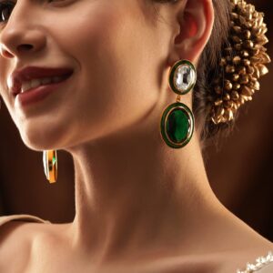 These premium drop earrings from feature 22K gold plating with emerald and white zirconia stones, offering an elegant and luxurious style. Perfect for adding a touch of sophistication to any outfit. These earrings make a bold and captivating accessory for special occasions. Material & Care Dimension : Earrings : 6 cm Material : Brass Weight : 29.82g Net Qnty : 1 Pair Earrings Care Label : It is advisable to avoid contact with water and organic chemicals i.e. perfume sprays. Store jewellery in airtight box. After use, wipe the jewellery with sof