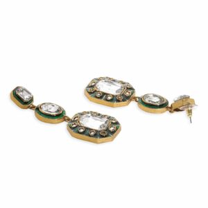 These statement dangle earrings are a striking blend of tradition and elegance, featuring 22K antique gold plating, intricate Kundan studding, and vivid green enamel work. These earrings make a bold and captivating accessory for special occasions. Material & Care Dimension : Length 8 cm Material : Brass Weight : 34.03g Net Qnty : 1 Pair Earrings Care Label : It is advisable to avoid contact with water and organic chemicals i.e. perfume sprays. Store jewellery in airtight box. After use, wipe the jewellery with soft cotton cloth.