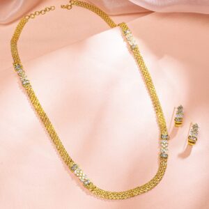 Jewellery Set : Elegant 22K gold-plated necklace & earrings set with AD & cubic zirconia detailing. The perfect blend of luxury & simplicity for weddings & festive occasions, elevating your look. Occasion : Bring your style to a whole new level with this handcrafted piece of jewelry. When you’re celebrating a weddings, festive occasions & traditional ceremonies, this piece adds that extra something that makes us feel special and looking our best. Material & Care Dimension : Length Size : Necklace : 26.5 cm, Earrings : 3 cm Dimension : Width : Necklace : 0.6 cm, Earrings : 2.2 cm Net Quantity : 1 Necklace & 1 Pair of Earrings Net Weight: 21.60 g Material : Brass Care Label : It is advisable to avoid contact with water and organic chemicals i.e. perfume sprays. Store jewellery in airtight box. After use, wipe the jewellery with soft cotton cloth.