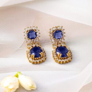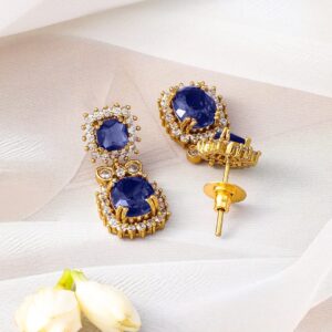 This exquisite 22K gold-plated necklace set features vibrant blue sapphire stones with dazzling cubic zirconia, complete with matching earrings for a luxurious traditional look. Material : & Care Dimension : Length : NS- 15 ; E- 3 cm Width : NS- 1.3 ; E- 1.2 cm Net Quantity : 1 Necklace & 1 Pair of Earrings Weight : 45.32 g Material : Brass Care Label : It is advisable to avoid contact with water and organic chemicals i.e. perfume sprays. Store jewellery in airtight box. After use, wipe the jewellery with soft cotton cloth.