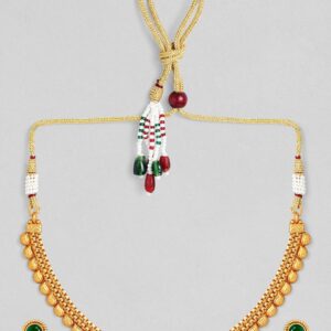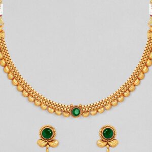 Necklace Set : This 22K gold-plated traditional necklace set features striking dark emerald green stones and elegant pearl bead accents. Its intricate design and craftsmanship bring a luxurious and sophisticated look, perfect for enhancing traditional attire. Occasion : Bring your style to a whole new level with this handcrafted piece of jewellery. When you’re celebrating a special Occasion : – a birthday, wedding, or personal milestone – this piece adds that extra something that makes us feel special and looking our best. Material : & Care Dimension : Length : NS- 15 ; E- 1.5 cm Width: NS- 3.4 ; E- 1.3 cm Material: Brass Net Weight: 25.8 Gram Net Quantity: 1 Necklace & 1 Pair of Earrings Care Label: It is advisable to avoid contact with water and organic chemicals i.e. perfume sprays. Store jewellery in airtight box. After use, wipe the jewellery with soft cotton cloth.