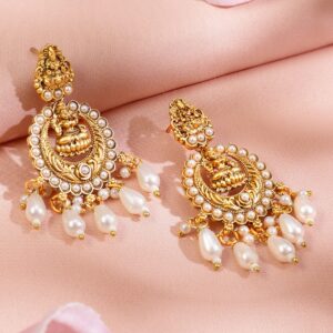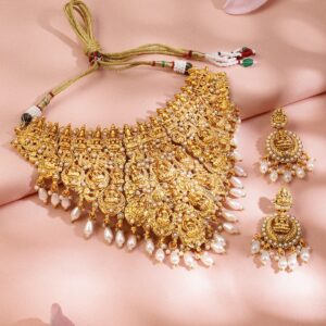 Jewellery Set : This 22K gold-plated choker necklace set is crafted in brass, featuring divine Lakshmi motifs, antique detailing, and white pearl drops—an opulent choice for bridal and festive grandeur. Perfect for Occasions: An exquisite choice for bridal wear, weddings, and temple ceremonies. The divine iconography and grand silhouette make it a must-have for festive rituals, cultural events, and bridal trousseaus. Material & Care Dimension : Length Size : Necklace : 16 cm, Earrings : 6 cm Dimension : Width : Necklace : 11 cm, Earrings : 2.5 cm Net Quantity : 1 Necklace & 1 Pair of Earrings Net Weight: 146.02 Gram Material : Brass Care Label : It is advisable to avoid contact with water and organic chemicals i.e. perfume sprays. Store jewellery in airtight box. After use, wipe the jewellery with soft cotton cloth.