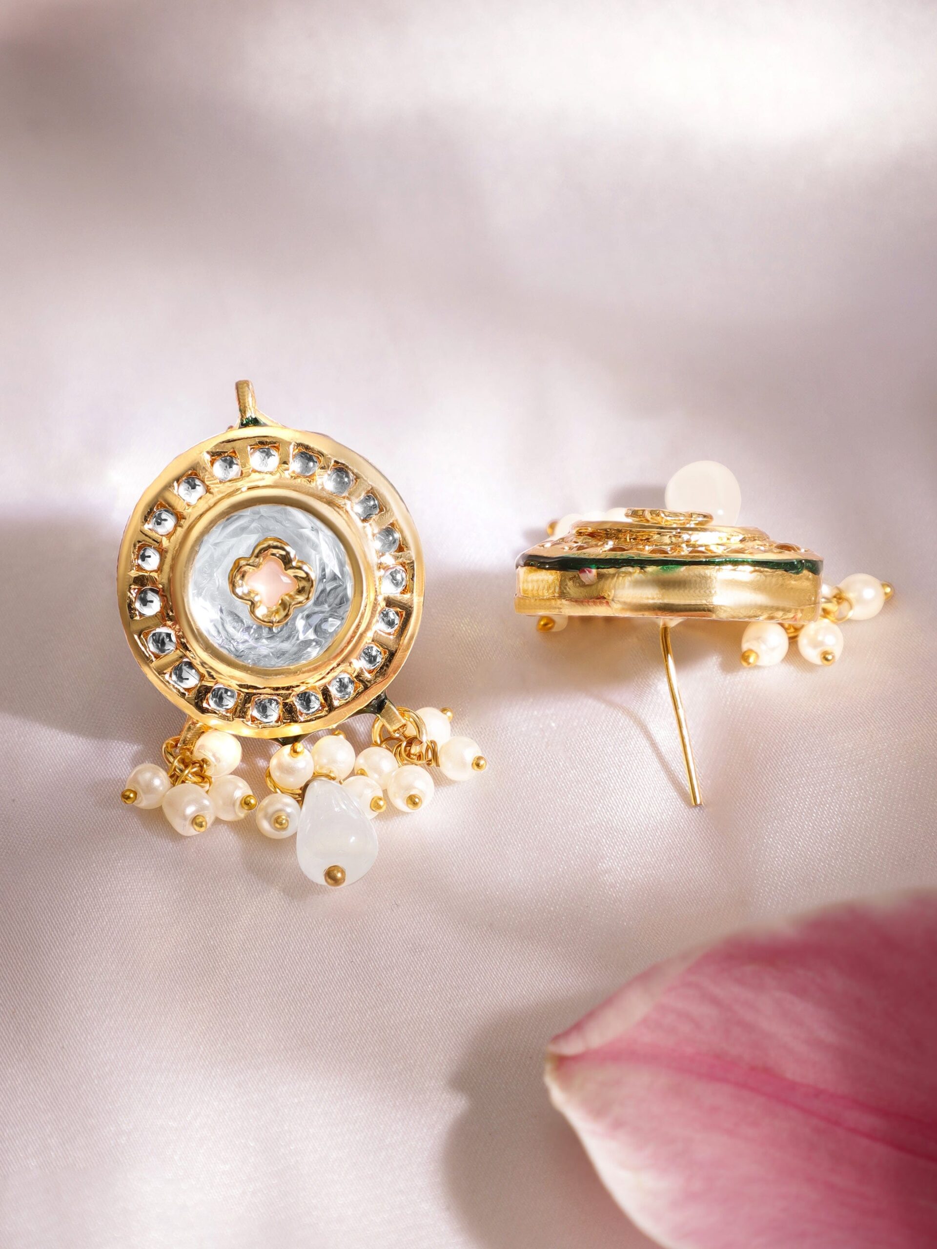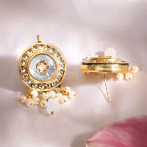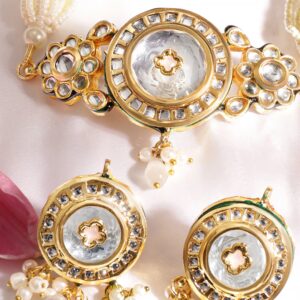 This regal necklace set features intricate Kundan crystals adorned with vibrant enamel detailing and lustrous pearls, creating a sophisticated and opulent design. The 22K gold plating adds a touch of luxury, making it the perfect accessory for special occasions. Elevate your look with this regal set that exudes timeless charm. Let the 22K gold plating and intricate design create an aura of timeless elegance and exquisite allure, making a statement of radiant grandeur and luxurious charm. Material & Care Dimension : Necklace :14 cm / 7 cm Earrings : 5 cm / 2.5 cm Material : Brass Weight : 70.46g Net Qnty : 1 Necklace, 1 Pair of Earrings Care Label : It is advisable to avoid contact with water and organic chemicals i.e. perfume sprays. Store jewellery in airtight box. After use, wipe the jewellery with soft