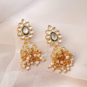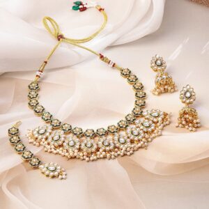 Jewellery Set : 22K gold-plated necklace set adorned with green enamel floral motifs, white kundan stones, and layered pearl beads. Includes earrings, maangtikka, and a regal choker necklace. Occasion : Bring your style to a whole new level with this handcrafted piece of jewelry. When you’re celebrating a weddings, festive occasions & traditional ceremonies, this piece adds that extra something that makes us feel special and looking our best. Material & Care Dimension : Length Size : Necklace : 12 cm, Earrings : 1.5 cm Dimension : Width : Necklace : 3.5 cm, Earrings : 1.5 cm Net Quantity : 1 Necklace & 1 Pair of Earrings Net Weight: 23.16 Gram Material : Brass Care Label : It is advisable to avoid contact with water and organic chemicals i.e. perfume sprays. Store jewellery in airtight box. After use, wipe the jewellery with soft cotton cloth.