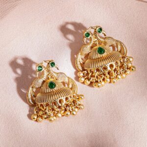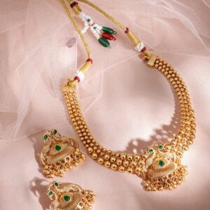 Traditional 22K gold-plated necklace set adorned with intricate peacock designs, green stones, and gold beads. A perfect blend of elegance and cultural charm. Occasion : Bring your style to a whole new level with this handcrafted piece of jewellery. When you’re celebrating a special Occasion : a birthday, wedding, festive or personal milestone this piece adds that extra something that makes us feel special and looking our best. Material & Care Dimension : Size : Necklace : 16 cm, Earrings : 3 cm Material: Brass Net Weight: 41.09 Gram Net Quantity: 1 Necklace & 1 Pair of Earrings Care Label: It is advisable to avoid contact with water and organic chemicals i.e. perfume sprays. Store jewellery in airtight box. After use, wipe the jewellery with soft cotton cloth.