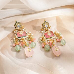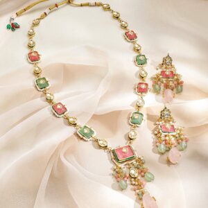 Jewellery Set : This 22K gold-plated necklace set showcases handcrafted meenakari artistry, kundan detailing, pastel pink and green floral beads, and CZ accents – a statement piece for royal weddings and luxurious festive styling. Occasion : Bring your style to a whole new level with this handcrafted piece of jewellery. When you’re celebrating a special Occasion : – a birthday, wedding, festive or personal milestone – this piece adds that extra something that makes us feel special and looking our best. Material & Care Dimension : Length : Necklace : 17 cm, Earrings : 5 cm Dimension : Length : Necklace : 3 cm, Earrings : 1.5 cm Collection : Kundan & Enamel Net Quantity : 1 Necklace & 1 pair of Earrings Net Weight: 67.37 gram Material : Brass Care Label : It is advisable to avoid contact with water and organic chemicals i.e. perfume sprays. Store jewellery in airtight box. After use, wipe the jewellery with soft cotton cloth.