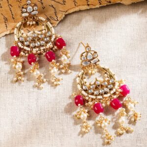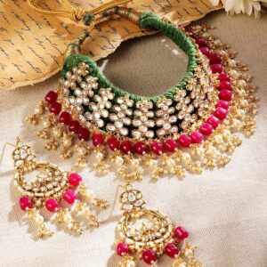 Jewellery Set : Experience the perfect blend of tradition and modern elegance with the 22K Gold Plated Handcrafted Kundan Choker Set. Each choker is meticulously handcrafted and features a luxurious 22K gold plating that radiates timeless sophistication. The intricate Kundan detailing is highlighted in a vibrant green hue and beautifully accented with striking ruby elements and delicate white beads. This harmonious interplay of colors and textures not only showcases exquisite craftsmanship but also creates a captivating statement piece suitable for weddings, festive occasions, or any special event. More than just an accessory, the choker set is a timeless heirloom designed to enhance your look with a unique touch of regal charm and contemporary flair. Occasion : Bring your style to a whole new level with this handcrafted piece of jewellery. When you’re celebrating a special Occasion : – a birthday, wedding, festive or personal milestone – this piece adds that extra something that makes us feel special and looking our best. Material : & Care Dimension : Length : 13 cm / 7 cm, Width: 9 cm / 3.5 cm Net Weight: 40.30 g Net Quantity : 1 Necklace & 1 Pair of Earrings Material : Brass Care Label : It is advisable to avoid contact with water and organic chemicals i.e. perfume sprays. Store jewellery in airtight box. After use, wipe the jewellery with soft cotton cloth.