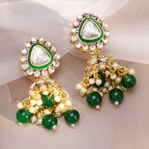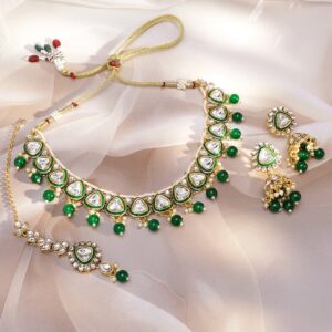 Jewellery Set: This 22K gold-plated handcrafted necklace set features white kundan stones bordered with green enamel and adorned with green beads. Comes with matching green beaded jhumka earrings with maangtikka. Ideal for Bridal & Festive Looks: Best suited for weddings, receptions, and traditional functions. Pair it with lehengas, sarees, or salwar suits for a regal appearance that celebrates Indian craftsmanship and festive flair. Material : & Care Dimension : Length : Necklace : 22 cm ; Earrings : 5.5 cm ; MaangTikka : 15 cm Width : Necklace : 3 cm ; Earrings : 2 cm ; MaangTikka : 3 cm Net Weight : 77.50 Gram Material : Brass Net Quantity : 1 Necklace, 1 Pair of Earrings & 1 Maangtikka Care Label : It is advisable to avoid contact with water and organic chemicals i.e. perfume sprays. Store jewellery in airtight box. After use, wipe the jewellery with soft cotton cloth.