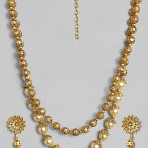 It’s a jewellery set fit for the queens! Exude the royal vibe with this stone studded jewellery set. Consisting of a necklace, matching earrings, this necklace set is crafted from gold-plated brass,¬† Occasion : Bring your style to a whole new level with this handcrafted piece of jewellery. When you’re celebrating a special Occasion : – a birthday, wedding, or personal milestone – this piece adds that extra something that makes us feel special and looking our best. Material : & Care Dimension :Necklace:¬†50 cm; Earrings: 4 .4 cm Material : ¬† Brass Care Label : It is advisable to avoid contact with water and organic chemicals i.e. perfume sprays. Store jewellery in airtight box. After use, wipe the jewellery with soft cotton cloth