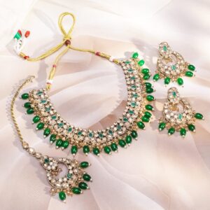 Jewellery Set: This 22K gold-plated handcrafted necklace set features white and green kundan stones, green drop beads, and off-white pearl beads. Includes earrings and crafted in premium brass material. Perfect for Traditional Events: Ideal for weddings, receptions, and festive occasions, this jewellery set pairs beautifully with sarees, lehengas, and ethnic gowns. Its handcrafted finish makes it a treasured piece in any bridal or festive wardrobe. Material : & Care Dimension : Length : Necklace : 11 cm ; Earrings : 6 cm ; MaangTikka : 15 cm Width : Necklace : 3 cm ; Earrings : 3 cm ; MaangTikka : 3.5 cm Net Weight : 90.81 Gram Material : Brass Net Quantity : 1 Necklace, 1 Pair of Earrings & 1 Maangtikka Care Label : It is advisable to avoid contact with water and organic chemicals i.e. perfume sprays. Store jewellery in airtight box. After use, wipe the jewellery with soft cotton cloth.