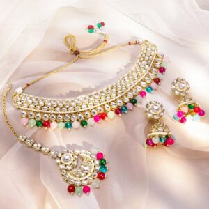 Jewellery Set: This 22K gold-plated handcrafted necklace set features white kundan and CZ work, vibrant multi-colored beaded edging, and matching earrings with maangtikka. Made in premium brass material for festive and bridal elegance. Ideal for Festive & Bridal Events: Designed for weddings, Navratri, Diwali, and classic celebrations. The color-rich detailing makes it ideal for lehengas, anarkalis, or vibrant sarees that demand a joyful and grand jewellery finish. Material : & Care Dimension : Length : Necklace : 16 cm ; Earrings : 4.5 cm ; MaangTikka : 15 cm Width : Necklace : 6 cm ; Earrings : 2.5 cm ; MaangTikka : 3.5 cm Net Weight : 156.50 Gram Material : Brass Net Quantity : 1 Necklace, 1 Pair of Earrings & 1 Maangtikka Care Label : It is advisable to avoid contact with water and organic chemicals i.e. perfume sprays. Store jewellery in airtight box. After use, wipe the jewellery with soft cotton cloth.