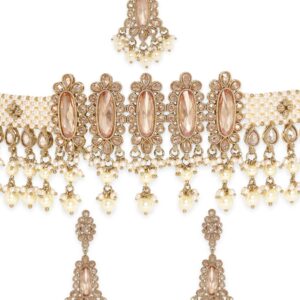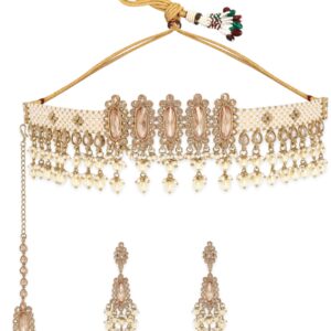 The intricate motifs and delicate craftsmanship of this exquisite ensemble evoke a sense of timeless elegance. The choker rests gracefully against your collarbone, offering a harmonious blend of opulence and tranquility, making it an enchanting accessory for those seeking a balance of grace and divinity. Material & Care Dimension : Necklace : 22 cm Earrings : 8.5 cm Material : Brass Weight : 121.68g Net Qnty : 1 Necklace, 1 Pair of Earrings, 1 Maang Tikka Care Label : It is advisable to avoid contact with water and organic chemicals i.e. perfume sprays. Store jewellery in airtight box. After use, wipe the jewellery with soft
