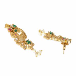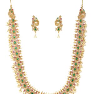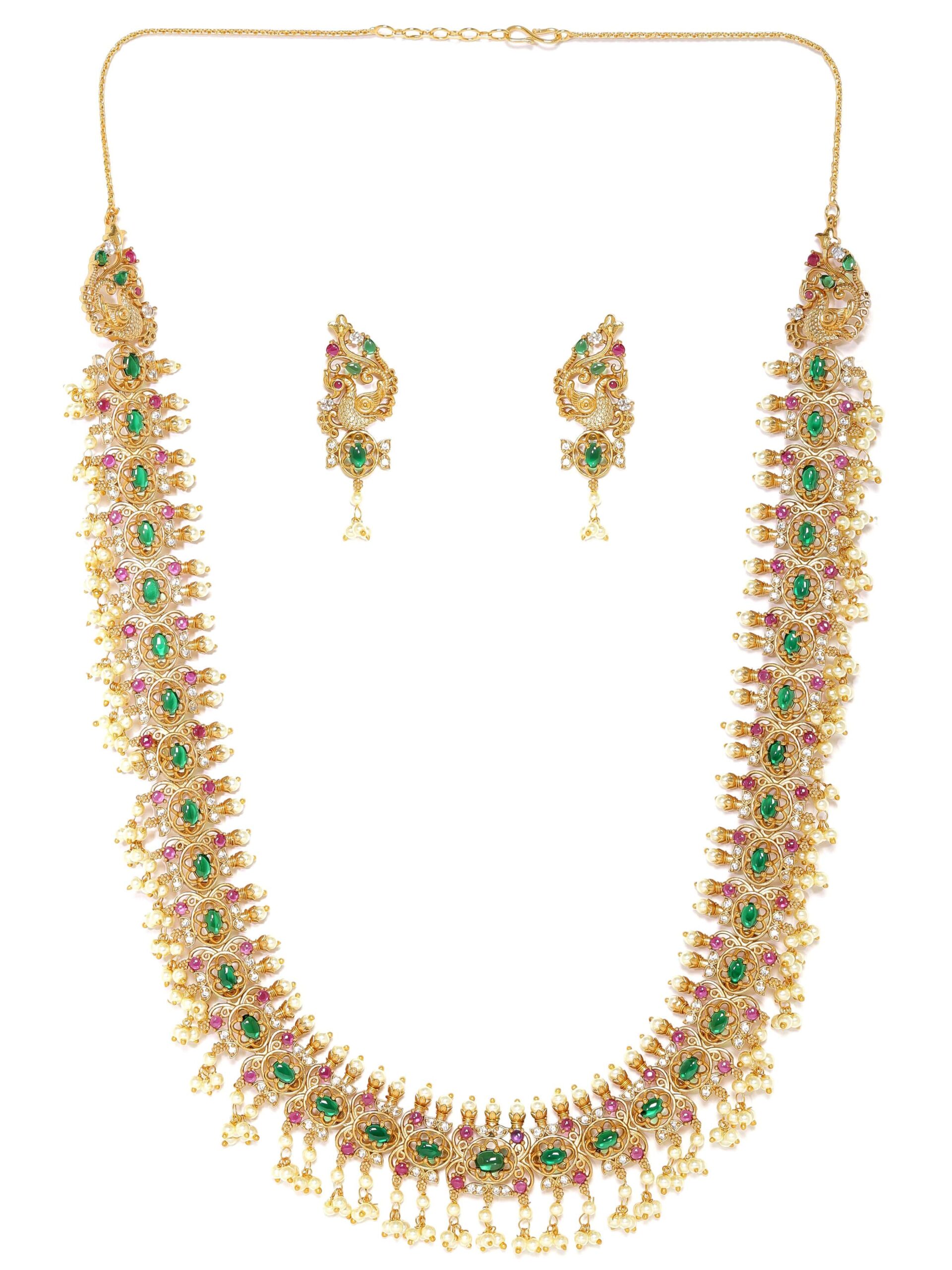 The fusion of elements exudes opulence and sophistication, perfect for enhancing your style. Embrace the captivating allure of this set, allowing the Kemp, Zirconia crystals, and pearls to grace your ensemble with a touch of refined beauty. Let the 22K gold plating and intricate craftsmanship create an aura of timeless charm and exquisite allure, making a statement of grandeur and luxurious elegance. Material & Care Dimension : Necklace : 50 cm Earrings : 5 cm Material : Brass Care Label : It is advisable to avoid contact with water and organic chemicals i.e. perfume sprays. Store jewellery in airtight box. After use, wipe the jewellery with sof