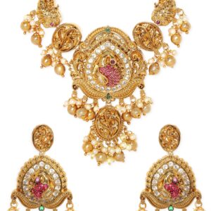 Embrace the captivating allure of this set, allowing the Kemp, zirconia, and pearls to grace your ensemble with a touch of refined beauty. Let the 22K gold plating and intricate craftsmanship create an aura of timeless charm and exquisite allure, making a statement of opulent beauty and luxurious grace. Material & Care Dimension : Necklace : 15 cm Earrings : 5.5 cm Material : Brass Care Label : It is advisable to avoid contact with water and organic chemicals i.e. perfume sprays. Store jewellery in airtight box. After use, wipe the jewellery with soft..