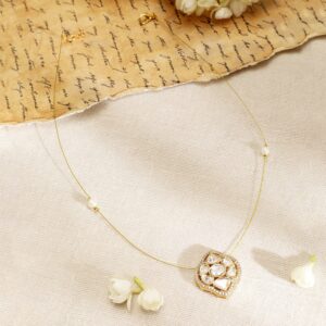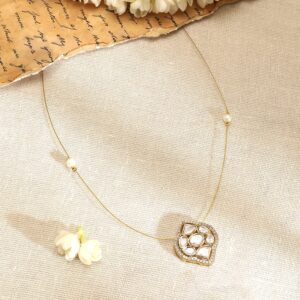 This elegant 22K gold-plated necklace features a traditional Kundan and Cubic Zirconia-studded pendant with subtle pearl detailing on a delicate chain. Perfect for adding a touch of sophistication to any ensemble. Occasion : Bring your style to a whole new level with this handcrafted piece of jewellery. When you’re celebrating a special Occasion : – a birthday, wedding, or personal milestone – this piece adds that extra something that makes us feel special and looking our best. Material : & Care Dimension : Necklace : Length : 46 cm Width : 2.5 cm Collection : Kundan(Gold) Material: Brass Net Weight: 5.94 Gram Net Quantity: 1 Necklace Care Label: It is advisable to avoid contact with water and organic chemicals i.e. perfume sprays. Store jewellery in airtight box. After use, wipe the jewellery with soft cotton cloth.