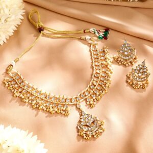 Jewellery Set : This handcrafted choker set features 22K gold plating with dazzling Kundan stones and delicate pearl bead accents, exuding timeless elegance for a perfect traditional look. Occasion : Bring your style to a whole new level with this handcrafted piece of jewellery. When you’re celebrating a special Occasion : – a birthday, wedding, or personal milestone – this piece adds that extra something that makes us feel special and looking our best. Material : & Care Dimension : Length : NS- 25 ; E-4. 5 cm, Width: NS- 7.5 ; E- 3 W Net Quantity : 1 Necklace & 2 Earrings Net Weight: 67.56 g Material :Brass Care Label : It is advisable to avoid contact with water and organic chemicals i.e. perfume sprays. Store jewellery in airtight box. After use, wipe the jewellery with soft cotton cloth.
