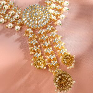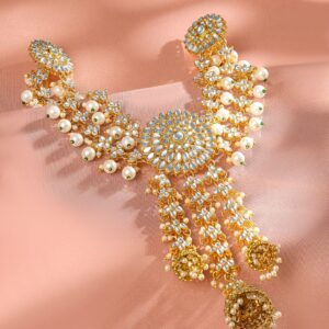 Hair Accessory : Exquisite 22K gold-plated bridal hair accessory featuring kundan and pearl embellishments, designed for a regal and elegant wedding look. Occasion : Bring your style to a whole new level with this handcrafted piece of jewellery. When you’re celebrating a special Occasion : – a birthday, wedding, or personal milestone – this piece adds that extra something that makes us feel special and looking our best. Material : & Care Dimension : Length : 25 cm, Width: 5 cm Net Weight: 125 g Net Quantity : 1 Hair Accessory Material :Brass Care Label : It is advisable to avoid contact with water and organic chemicals i.e. perfume sprays. Store jewellery in airtight box. After use, wipe the jewellery with soft cotton cloth.