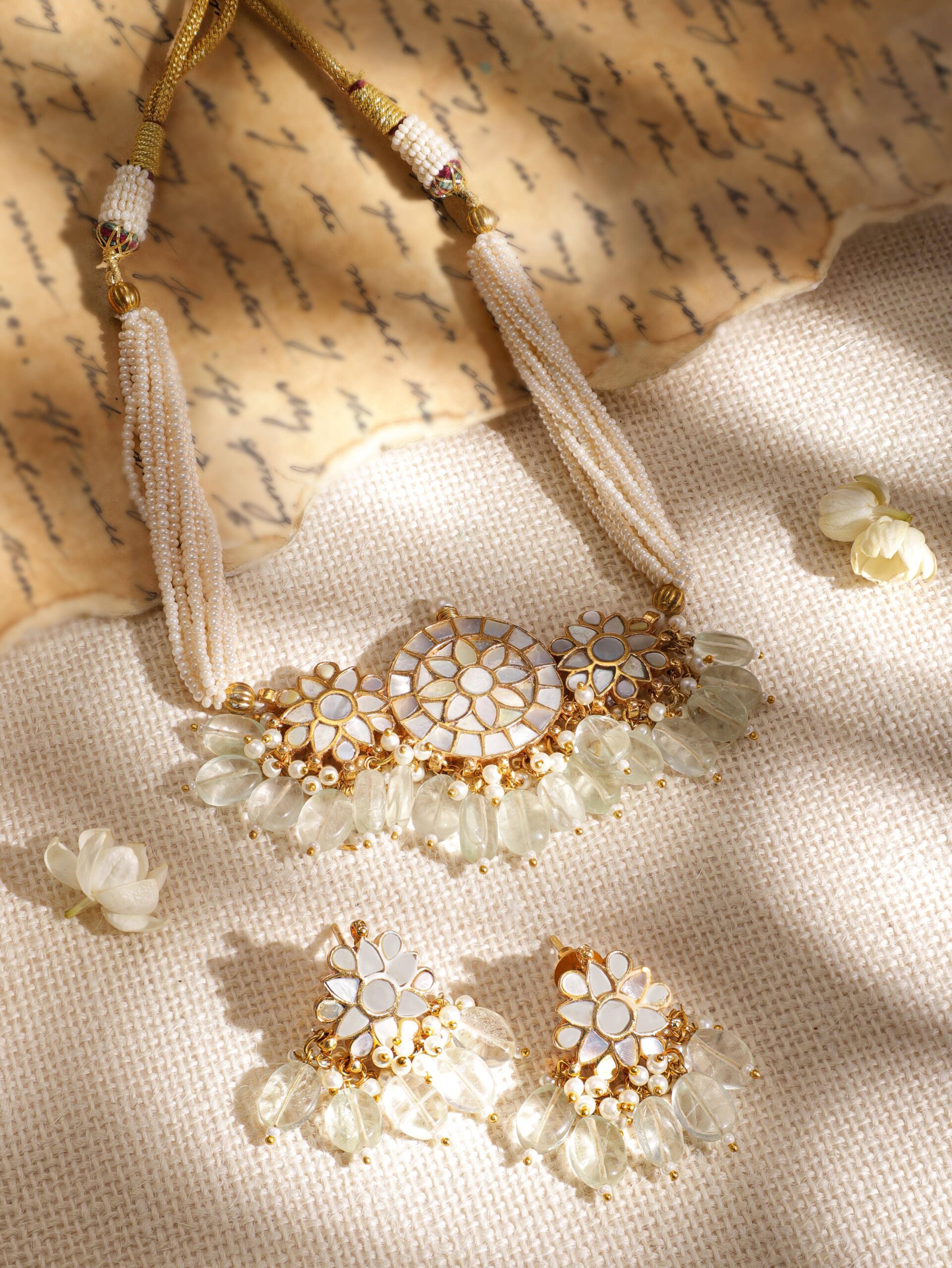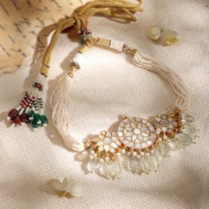 Jewellery Set: One of the most versatile forms of ornate designs that goes well with every style and personality. Wear one of these and you do not have to worry about any other accessory. Occasion : Bring your style to a whole new level with this handcrafted piece of jewellery. When you’re celebrating a special Occasion : – a birthday, wedding, or personal milestone – this piece adds that extra something that makes us feel special and looking our best. Material : & Care Dimension :Length : 13 cm / 4 cm, Width: 12 cm / 2 cm Material :Brass Weight : 74.73g Net Qnty : 1 Necklace, 1 Pair of Earrings Care Label : It is advisable to avoid contact with water and organic chemicals i.e. perfume sprays. Store jewellery in airtight box. After use, wipe the jewellery with soft cotton cloth.