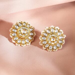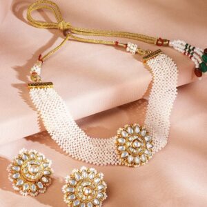 Jewellery Set : This exquisite 22K gold-plated choker necklace set is adorned with sparkling Kundan stones and delicate pearl beads. The floral-inspired design adds a royal touch, making it a statement piece for brides and festive occasions. Occasion : Bring your style to a whole new level with this handcrafted piece of jewellery. When you’re celebrating a special Occasion : – a birthday, wedding, or personal milestone – this piece adds that extra something that makes us feel special and looking our best. Material : & Care Dimension : Length : 19 cm / 3 cm, Width: 3.3 cm / 3.3 cm Net Weight: 40.30 g Net Quantity : 1 Necklace & 2 Earrings Material :Brass Care Label : It is advisable to avoid contact with water and organic chemicals i.e. perfume sprays. Store jewellery in airtight box. After use, wipe the jewellery with soft cotton cloth.