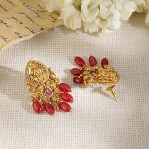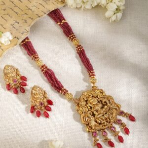 Jewellery Set : Elevate your traditional look with ‘ 22K gold-plated temple jewelry set. Featuring a stunning Lakshmi motif, this set combines ruby studs, cubic zirconia (CZ), and intricate beading in a multistrand design. Handcrafted for an exquisite finish, it adds a touch of regal elegance to any collection. Occasion : Bring your style to a whole new level with this handcrafted piece of jewellery. When you’re celebrating a special Occasion : – a birthday, wedding, or personal milestone – this piece adds that extra something that makes us feel special and looking our best. Material : & Care Dimension : Size : Necklace : 35 cm, Earrings : 4 cm Material :Brass Care Label : It is advisable to avoid contact with water and organic chemicals i.e. perfume sprays. Store jewellery in airtight box. After use, wipe the jewellery with soft cotton cloth.