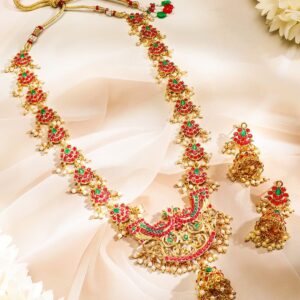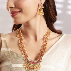 This 22K gold-plated handcrafted long jewellery set features an intricately designed necklace adorned with vibrant ruby red and emerald green stones. The grand pendant showcases exquisite detailing, complemented by delicate pearl bead embellishments. Paired with matching jhumka earrings, this set is a perfect choice for weddings, festive occasions, and cultural celebrations. Occasion : Bring your style to a whole new level with this handcrafted piece of jewellery. When you’re celebrating a special Occasion : – a birthday, wedding, festive or personal milestone – this piece adds that extra something that makes us feel special and looking our best. Material & Care Dimension : Necklace 60.5 cm ,Earrings – 5.3 cm Collection : Temple Material : Brass Net Quantity: 1 Necklace & 1 Pair of Earrings Care Label : It is advisable to avoid contact with water and organic chemicals i.e. perfume sprays. Store jewellery in airtight box. After use, wipe the jewellery with soft cotton cloth