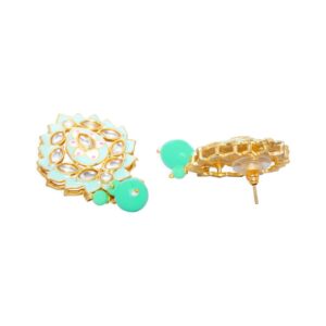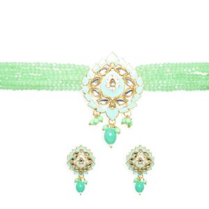 Necklace Set : Make a graceful statement with this 22K Gold-Plated Choker Set, featuring soothing mint green beads meticulously woven to create a stunning piece. The centerpiece of this choker showcases intricate Kundan work, enhanced by delicate enamel detailing, and is complemented by matching earrings. The combination of mint green beads and gold-plated elements gives this set a refreshing yet traditional appeal, perfect for adding a touch of elegance to your festive wardrobe. The detailed craftsmanship of the Kundan work makes this set a standout accessory for special occasions. Occasion : Bring your style to a whole new level with this handcrafted piece of jewellery. When you’re celebrating a special Occasion : – a birthday, wedding, or personal milestone – this piece adds that extra something that makes us feel special and looking our best. Material : & Care Dimension : Size: Necklace : 19 cm, Earrings : 6 cm Material: Brass Net Weight: 44 Gram Net Quantity: 1 Necklace & 1 Pair of Earrings Care Label: It is advisable to avoid contact with water and organic chemicals i.e. perfume sprays. Store jewellery in airtight box. After use, wipe the jewellery with soft cotton cloth.