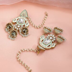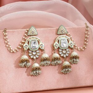 Jhumka Earrings : These 22K gold-plated chandbali earrings feature mint green enamel, white Kundan, and layered dome-shaped jhumkas hanging below. Adorned with pearl beadwork and an elegant ear chain – ideal for bridal celebrations. Occasion : Bring your style to a whole new level with this handcrafted piece of jewellery. When you’re celebrating a special Occasion : – a birthday, wedding, or personal milestone – this piece adds that extra something that makes us feel special and looking our best. Material & Care Dimension : Length: 9 cm ; Width : 4 cm Collection : Kundan with Enamel Material: Brass Net Weight: 76.03 Gram Net Quantity: 1 Pair of Earrings Care Label: It is advisable to avoid contact with water and organic chemicals i.e. perfume sprays. Store jewellery in airtight box. After use, wipe the jewellery with soft cotton cloth.