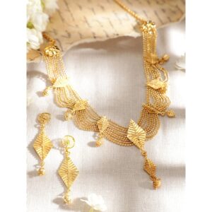 It’s a jewellery set fit for the queens! Exude the royal vibe with this stone studded jewellery set. Consisting of a necklace, matching earrings, this necklace set is crafted from gold-plated brass, stones and beads. Occasion : Bring your style to a whole new level with this handcrafted piece of jewellery. When you’re celebrating a special Occasion : – a birthday, wedding, festive or personal milestone – this piece adds that extra something that makes us feel special and looking our best. Material & Care Dimension : Necklace 51 cm; Earrings 5.8 cm Material : Brass Care Label : It is advisable to avoid contact with water and organic chemicals i.e. perfume sprays. Store jewellery in airtight box. After use, wipe the jewellery with soft cotton cloth