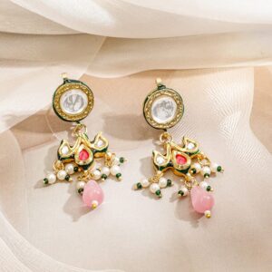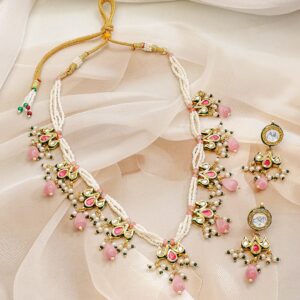 This handcrafted 22K gold-plated necklace set features multicolor kundan, pink beads, and layered white pearl strings – a stunning choice for weddings, haldi, mehndi, and festive occasions. Occasion : Bring your style to a whole new level with this handcrafted piece of jewellery. When you’re celebrating a special Occasion : – a birthday, wedding, festive or personal milestone – this piece adds that extra something that makes us feel special and looking our best. Material & Care Dimension : Necklace Length = 22 cm ; Earrings Length = 6 cm Necklace Width = 2 cm ; Earrings Width = 2 cm Net Weight : 70.03 Gram Material : Brass Plating : Gold Plating Collection : Kundan, Pearls & Beads Net Quantity: 1 Necklace and 1 Pair of Earrings Care Label: It is advisable to avoid contact with water and organic chemicals i.e. perfume sprays. Store jewellery in airtight box. After use, wipe the jewellery with soft cotton cloth.