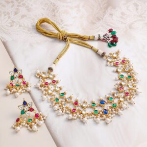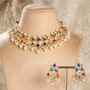 This 22K gold-plated choker necklace set features vibrant red, green, and blue stones with intricate pearl accents, perfect for a touch of timeless elegance at weddings or festive celebrations. Occasion : Bring your style to a whole new level with this handcrafted piece of jewellery. When you’re celebrating a special Occasion : – a birthday, wedding, festive or personal milestone – this piece adds that extra something that makes us feel special and looking our best. Material & Care Dimension : Length : Necklace : 13 cm ; Earrings : 3.5 cm Width : Necklace : 3.5 cm ; Earrings : 1.5 cm Collection : Gold Plated with AD and Cubic Zicronia Material: Brass Net Weight: 65.92 Gram Net Quantity: 1 Necklace & 1 Pair of Earrings Care Label: It is advisable to avoid contact with water and organic chemicals i.e. perfume sprays. Store jewellery in airtight box. After use, wipe the jewellery with soft cotton cloth.