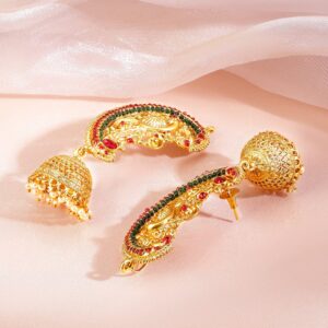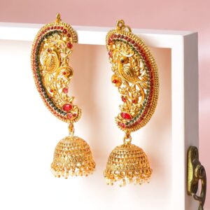 These 22K gold-plated ear-cuff jhumkas feature ruby red and emerald green stones with a peacock motif and dome ghungroo drops—ideal for bridal, festive, and bold traditional looks. Perfect for Bridal & Festive Looks: These earrings are perfect for bridal outfits, temple jewelry styling, and grand cultural occasions. They pair beautifully with lehengas, Kanjivaram sarees, or anarkalis. Material & Care Dimension : Length: 7 cm Dimension : Width: 3.5 cm Net Weight : 25 Gram Net Quantity : 1 pair of Ear cuff Jhumka Earrings Material : Brass Care Label : It is advisable to avoid contact with water and organic chemicals i.e. perfume sprays. Store jewellery in airtight box. After use, wipe the jewellery with soft cotton cloth.