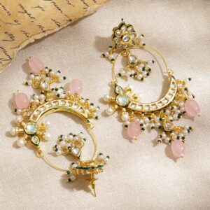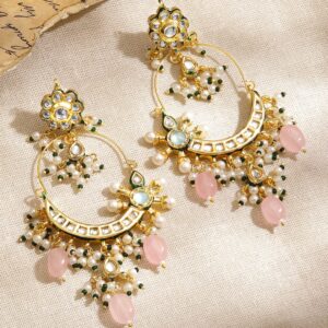 These 22K gold-plated Pachi Kundan chandbali earrings feature intricate floral tops, rosy pink bead drops, and layers of pearl and green beaded accents – a royal addition to wedding and festive wardrobes. Perfect for Weddings: Whether styled with a lehenga or saree, these earrings are a perfect choice for brides, bridesmaids, or guests attending traditional functions, haldi, mehendi, and wedding celebrations. Material & Care Dimension : Length : 1 cm Width : 5 cm Material : Brass Weight : 54.11 gram Net Qnty : 1 Pair Earrings Collection : Kundan, Pearls & Beads Care Label : It is advisable to avoid contact with water and organic chemicals i.e. perfume sprays. Store jewellery in airtight box. After use, wipe the jewellery with soft cotton cloth.