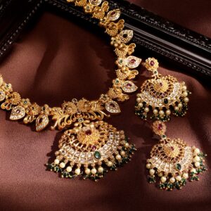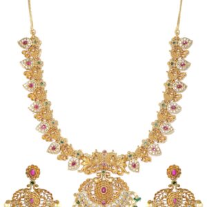 The fusion of elements exudes opulence and sophistication, perfect for enhancing your style. Embrace the captivating allure of this set, allowing the peacock motif, Kemp, Zirconia crystals, and pearls to grace your ensemble with a touch of refined beauty. Let the 22K gold plating and intricate craftsmanship create an aura of timeless charm and exquisite allure, making a statement of grandeur and regal elegance inspired by the resplendent peacock. Material & Care Dimension : Necklace : 16 cm Earrings : 5 cm Material : Brass Care Label : It is advisable to avoid contact with water and organic chemicals i.e. perfume sprays. Store jewellery in airtight box. After use, wipe the jewellery with sof