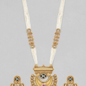 This 22K gold-plated necklace set features a multistrand pearl beaded design with intricate Kundan and ruby accents. Paired with matching earrings, it’s the perfect piece for traditional look. Occasion : Bring your style to a whole new level with this handcrafted piece of jewellery. When you’re celebrating a special Occasion : – a birthday, wedding, festive or personal milestone – this piece adds that extra something that makes us feel special and looking our best. Material & Care Dimension : Length : Necklace – 65.2 cm ; Earrings – 6.5 cm Material : Brass Care Label : It is advisable to avoid contact with water and organic chemicals i.e. perfume sprays. Store jewellery in airtight box. After use, wipe the jewellery with soft cotton cloth.