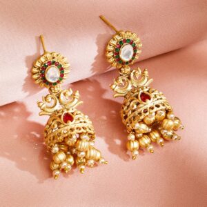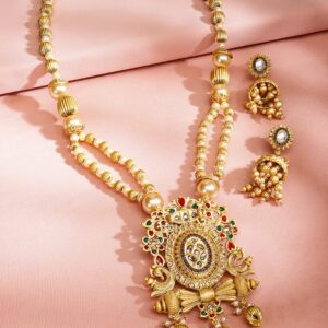 Immerse yourself in the captivating beauty of our “Radiant Serenade” necklace set, a stunning ensemble that harmoniously blends gold tones, a gilded pendant, golden beads, and a chain adorned with luminous white pearls. The necklace showcases a radiant gold-toned pendant, intricately designed to capture the essence of elegance and allure. Along the chain, delicate golden beads and lustrous white pearls intertwine, creating a graceful cascade that exudes opulence and refinement. Material & Care Dimension : Length : Necklace : 30 cm Earrings : 5.5 cm Width : Necklace : 2 cm Earrings : 5.5 cm Material: Brass Net Weight : 98.50 Gram Net Quantity: 1 Necklace & 1 Pair of Earrings Care Label: It is advisable to avoid contact with water and organic chemicals i.e. perfume sprays. Store jewellery in airtight box. After use, wipe the jewellery with soft cotton cloth.