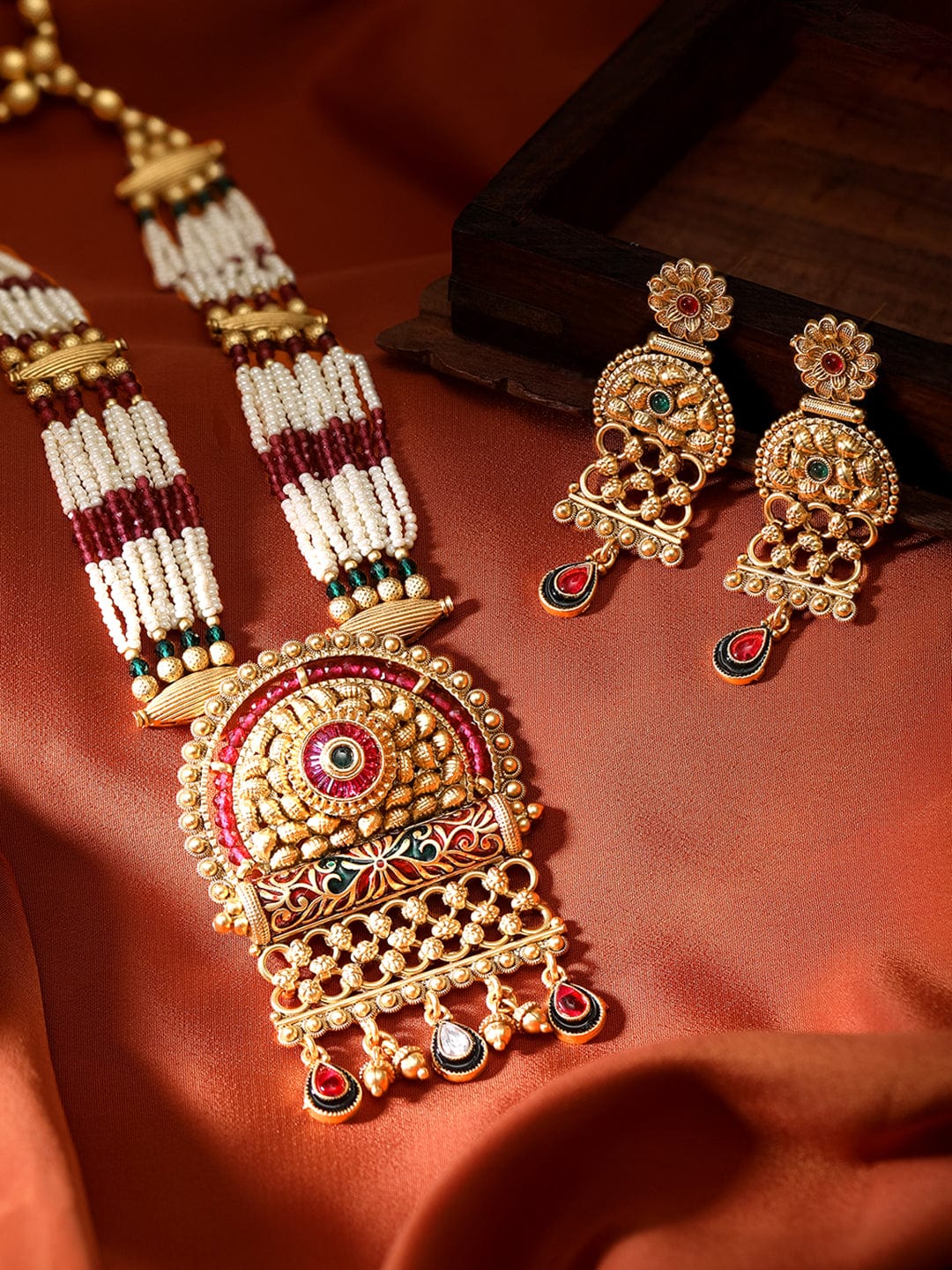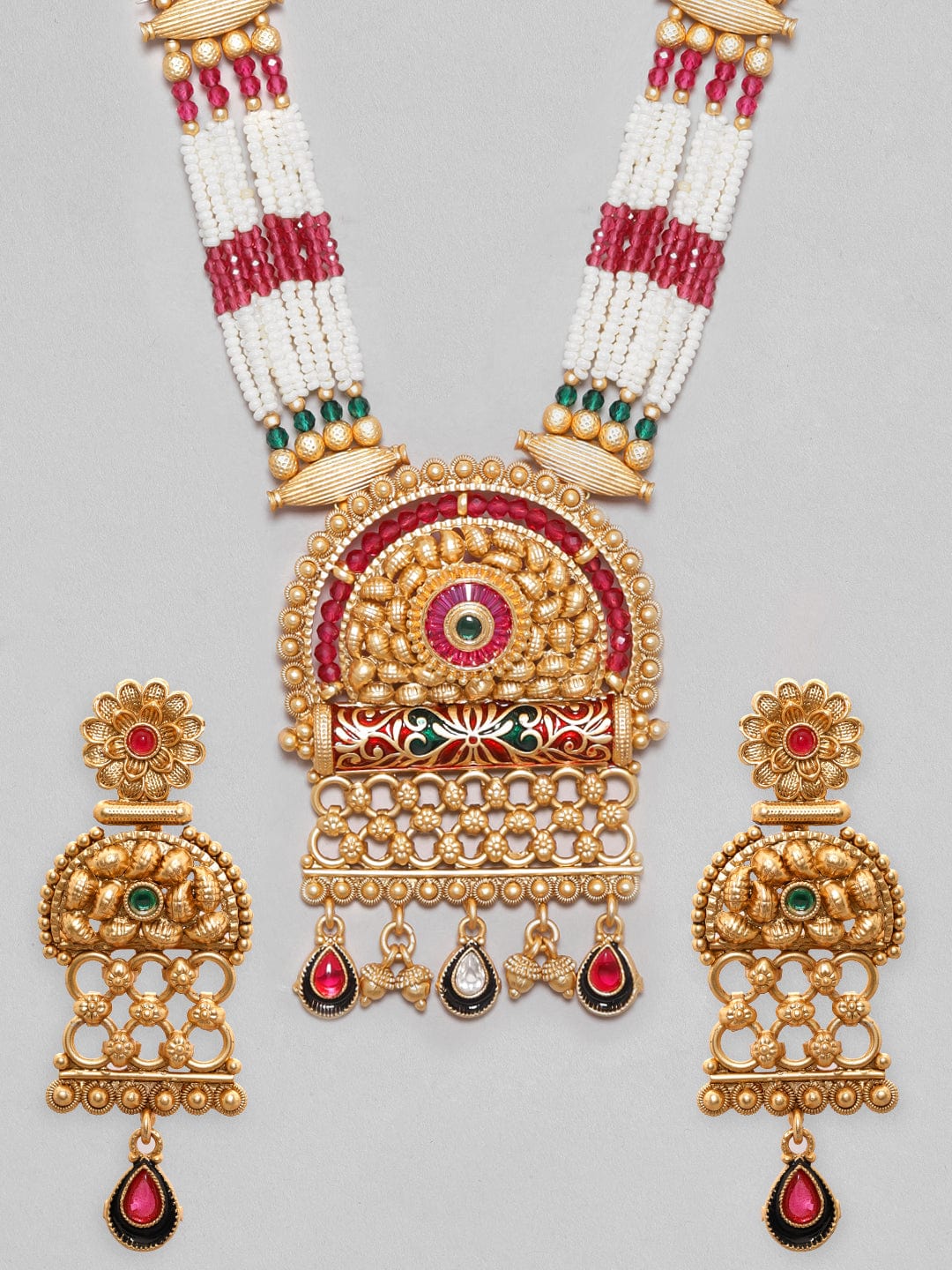 22K Gold Plated Red & Green Enamel Pearl Beaded Necklace Set – Gold