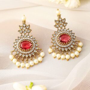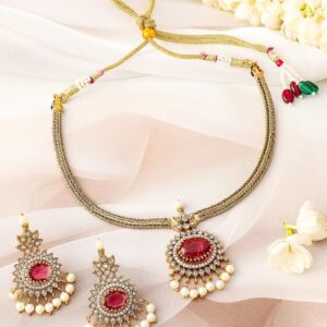 22K gold-plated necklace set featuring a bold ruby centerpiece, surrounded by cubic zirconia accents and adorned with elegant pearl drops. A timeless traditional accessory. Material & Care Dimension : Length : Necklace : 13 cm Earrings : 4.5 cm Width : Necklace : 2.5 cm Earrings : 2.5 cm Material: Brass Net Weight: 60,03 Gram Net Quantity: 1 Necklace & 1 Pair of Earrings Care Label: It is advisable to avoid contact with water and organic chemicals i.e. perfume sprays. Store jewellery in airtight box. After use, wipe the jewellery with soft cotton cloth.