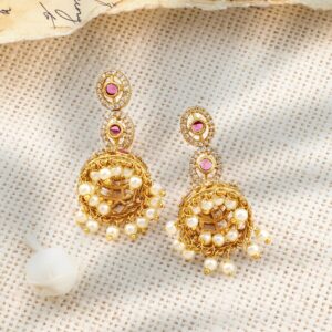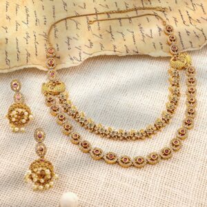 This 22K gold-plated double-layer necklace set is adorned with ruby, emerald, and cubic zirconia stones. The intricate craftsmanship and pearl drops add a regal touch to your traditional ensemble. Material : & Care Dimension : Length: NS- 15; E- 2 cm Width : NS- 2; E- 2 cm Material : Brass Care Label : It is advisable to avoid contact with water and organic chemicals i.e. perfume sprays. Store jewellery in airtight box. After use, wipe the jewellery with soft cotton cloth.