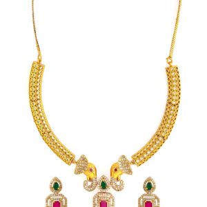 Jewellery Set : This stunning 22K gold-plated necklace set features a unique design with intricate elephant motifs, symbolizing strength and grace. Adorned with radiant ruby and emerald stones, the necklace is a perfect blend of traditional charm and modern elegance. The matching earrings mirror the necklace’s design, completing the set with a harmonious touch. Ideal for adding a regal touch to your attire, this necklace set is a must-have for any jewelry collection, perfect for special occasions and celebrations. Occasion : Bring your style to a whole new level with this handcrafted piece of jewellery. When you’re celebrating a special Occasion : – a birthday, wedding, or personal milestone – this piece adds that extra something that makes us feel special and looking our best. Material : & Care Dimension : Size : Length : 14 cm, Width : 4 cm Material: Brass Net Weight: 33.18 Gram Net Quantity: 1 Necklace & 1 Pair of Earrings Care Label: It is advisable to avoid contact with water and organic chemicals i.e. perfume sprays. Store jewellery in airtight box. After use, wipe the jewellery with soft cotton cloth.