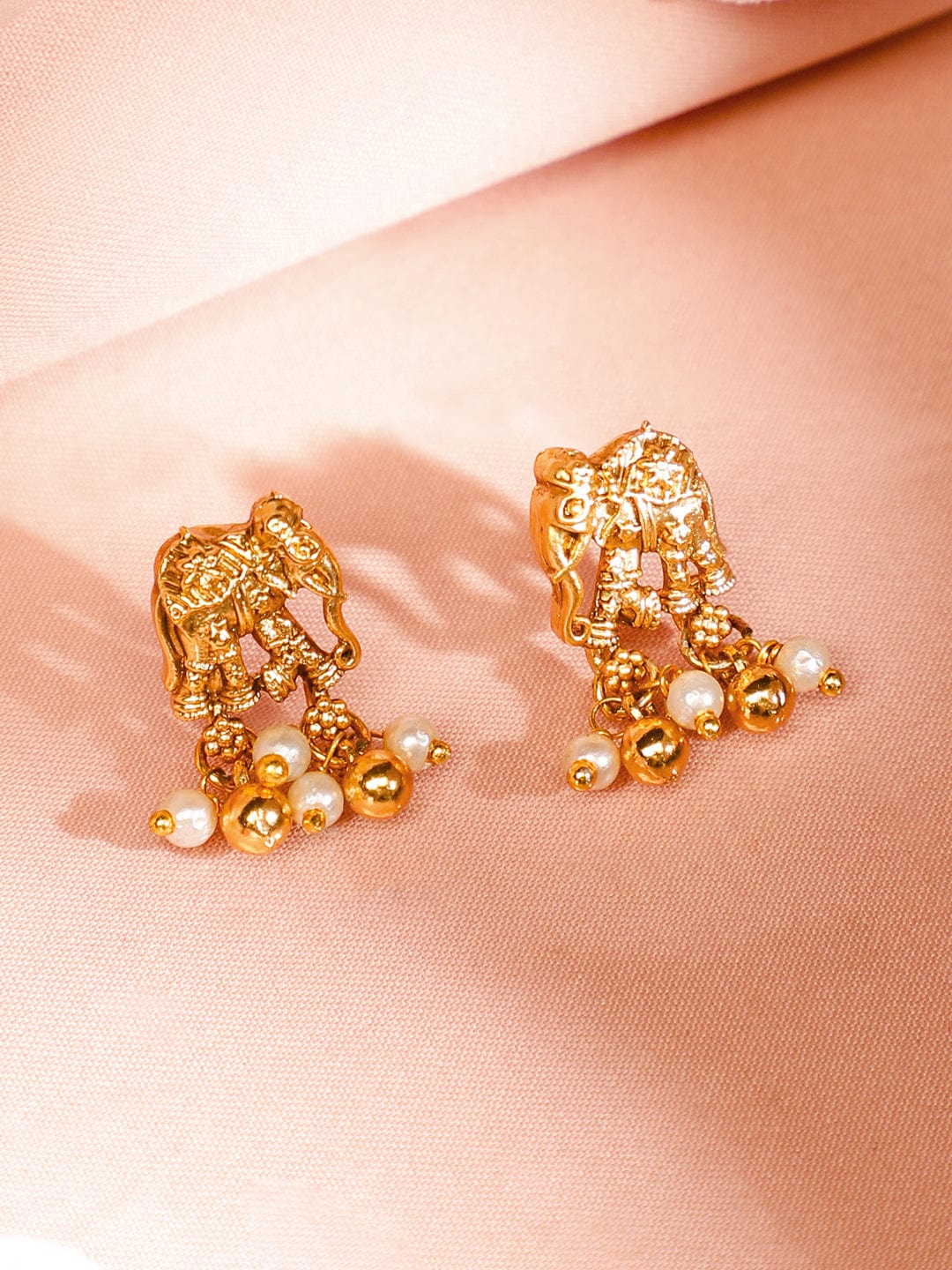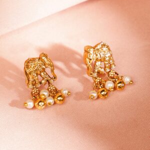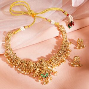 Jewellery Set : This 22K gold-plated temple necklace set features a divine ganesh motif, ruby and emerald stone accents, and pearl beaded drops with earrings—perfect for women & girls for festive and wedding looks. Occasion : Bring your style to a whole new level with this handcrafted piece of jewelry. When you’re celebrating a weddings, festive occasions & traditional ceremonies, this piece adds that extra something that makes us feel special and looking our best. Material & Care Dimension : Length Size : Necklace : 19 cm, Earrings : 2 cm Dimension : Width : Necklace : 3 cm, Earrings : 1 cm Net Quantity : 1 Necklace & 1 Pair of Earrings Net Weight: 60.36 Gram Material : Brass Care Label : It is advisable to avoid contact with water and organic chemicals i.e. perfume sprays. Store jewellery in airtight box. After use, wipe the jewellery with soft cotton cloth.