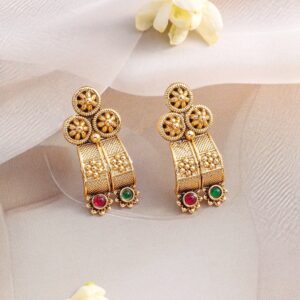 Necklace Set : This 22K gold-plated handcrafted necklace set features intricate detailing with ruby and emerald stones, adding a touch of regal elegance to any outfit. Occasion : Bring your style to a whole new level with this handcrafted piece of jewellery. When you’re celebrating a special Occasion : – a birthday, wedding, or personal milestone – this piece adds that extra something that makes us feel special and looking our best. Material : & Care Dimension : Length: : NS = 14 cm ; E = 2.2 cm Width : NS = 2.9 cm ; E = 1.2 cm Material :Brass Care Label : It is advisable to avoid contact with water and organic chemicals i.e. perfume sprays. Store jewellery in airtight box. After use, wipe the jewellery with soft cotton cloth.