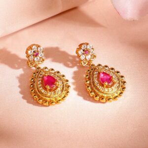 Jewellery Set : This 22K gold-plated handcrafted necklace set features ruby pink and emerald green cubic zirconia stones, intricately arranged with golden filigree detailing and delicate embellishments. A regal choice for weddings and festive occasions, radiating elegance and opulence. Occasion : Bring your style to a whole new level with this handcrafted piece of jewellery. When you’re celebrating a special Occasion : – a birthday, wedding, or personal milestone – this piece adds that extra something that makes us feel special and looking our best. Material : & Care Dimension : Size : Necklace : 17 cm, Earrings : 3 cm Net Quantity : 1 Necklace & 2 Earrings Net Weight: 38.07 g Material :Brass Care Label : It is advisable to avoid contact with water and organic chemicals i.e. perfume sprays. Store jewellery in airtight box. After use, wipe the jewellery with soft cotton cloth.