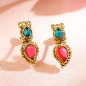 Necklace Set : This 22K gold-plated necklace set features ruby pink and emerald green teardrop stones suspended from a golden textured chain. Paired with matching earrings, it’s ideal for weddings, festivities, and traditional wear. Occasion & Versatility: Ideal for weddings, cultural ceremonies, and festive wear, this necklace set elevates any saree or lehenga ensemble. Its adjustable fit and vibrant gemstones make it a versatile and elegant addition to premium jewelry collections. Material : & Care Dimension : Length : NS = 23 cm ; E = 2 cm Width: NS = 2 cm ; E = 0.8 cm Material: Brass Net Weight: 27.16 Gram Net Quantity: 1 Necklace & 1 Pair of Earrings Care Label: It is advisable to avoid contact with water and organic chemicals i.e. perfume sprays. Store jewellery in airtight box. After use, wipe the jewellery with soft cotton cloth.