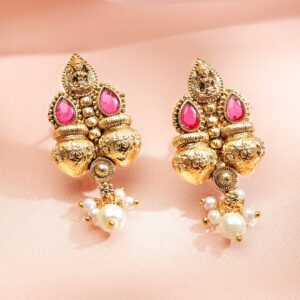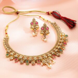 Necklace Set: This 22K gold-plated brass necklace set features ruby pink and emerald stones with golden beaded design and pearl drops—perfect for traditional, festive, and ethnic looks for women & girls. Occasion Styling: Ideal for brides and festive occasions, this traditional necklace set pairs beautifully with sarees, lehengas, and ethnic wear for a grand and timeless appearance. Material & Care Dimension : Length : Necklace : 17 cm Earrings : 2.5 cm Width : Necklace : 6 cm Earrings : 2 cm Material: Brass Net Weight: 67.97 Gram Net Quantity: 1 Necklace & 1 Pair of Earrings Care Label: It is advisable to avoid contact with water and organic chemicals i.e. perfume sprays. Store jewellery in airtight box. After use, wipe the jewellery with soft cotton cloth.