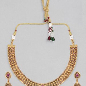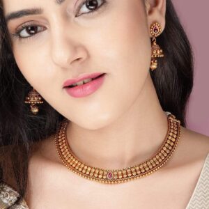 This 22K gold-plated handcrafted temple necklace set features Kundan stones and ruby pink accents. Paired with traditional jhumka earrings, this set is a perfect accessory for elevating ethnic wear. Occasion : Bring your style to a whole new level with this handcrafted piece of jewellery. When you’re celebrating a special Occasion : – a birthday, wedding, festive or personal milestone – this piece adds that extra something that makes us feel special and looking our best. Material & Care Dimension : Necklace – 11.5 cm, Earrings – 4.5 cm Net Quantity : Necklace and pair of Earrings Collection : Temple Material : Brass Care Label : ¬†It is advisable to avoid contact with water and organic chemicals i.e. perfume sprays. Store jewellery in airtight box. After use, wipe the jewellery with soft cotton cloth