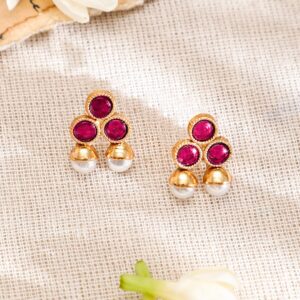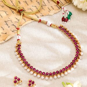 Adorned with radiant ruby pink stones and lustrous pearls, this 22K gold-plated jewellery set exudes classic elegance. A perfect choice for enriching your traditional attire with a touch of luxury. Material : & Care Dimension : Necklace & Earrings : Length : NS- 20 ; E- 1.5 cm Width :NS- 1 ; E- 1. W Material: Brass Net Weight: 26,54 Gram Net Quantity: 1 Necklace & 1 Pair of Earrings Care Label: It is advisable to avoid contact with water and organic chemicals i.e. perfume sprays. Store jewellery in airtight box. After use, wipe the jewellery with soft cotton cloth.