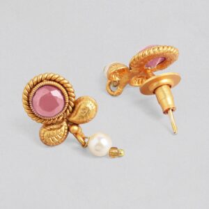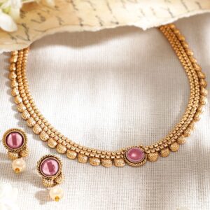 Necklace Set : This 22K gold-plated traditional necklace set showcases luxurious ruby pink stones paired with pearl beads, adding a rich and elegant touch to your traditional wardrobe. The intricate craftsmanship enhances the timeless design. Occasion : Bring your style to a whole new level with this handcrafted piece of jewellery. When you’re celebrating a special Occasion : – a birthday, wedding, or personal milestone – this piece adds that extra something that makes us feel special and looking our best. Material : & Care Dimension : Length : NS- 15 ; E- 1.5 cm Width: NS- 3.4 ; E- 1.3 cm Material: Brass Net Weight: 25.308 Gram Net Quantity: 1 Necklace & 1 Pair of Earrings Care Label: It is advisable to avoid contact with water and organic chemicals i.e. perfume sprays. Store jewellery in airtight box. After use, wipe the jewellery with soft cotton cloth.