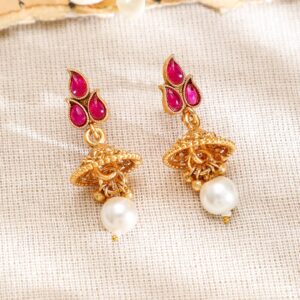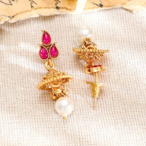 This 22K gold-plated jewellery set is adorned with vibrant pink stones and delicate pearl drops. Perfectly crafted for a timeless traditional look, it includes a matching necklace and earrings. Material : & Care Dimension : Length: NS- 15 ; E- 4 cm Width : NS- 3.5 ; E- 1.5 W Material: Brass Net Weight: 40.02 Gram Net Quantity: 1 Necklace & 1 Pair of Earrings Care Label: It is advisable to avoid contact with water and organic chemicals i.e. perfume sprays. Store jewellery in airtight box. After use, wipe the jewellery with soft cotton cloth.
